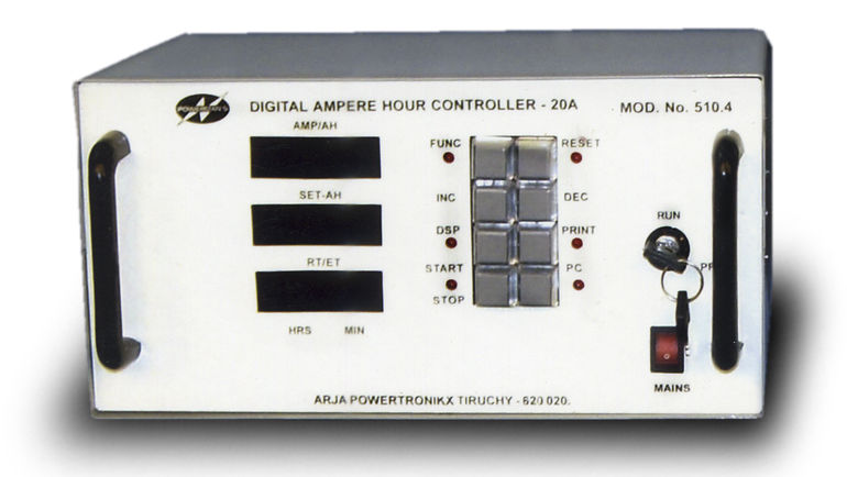 No.510.4: This is an Ampere-Hour Indicator Cum controller. This Meter Consists of a 3½ Digit Ammeter, 4 Digit Seven Segment LED Display of Ampere-Hour Indication. Front panel key switches are provided by which the ampere-Hour can be set. Once the set Ampere-Hour is reached a relay operated and the ampere – Hour counting Stopped.