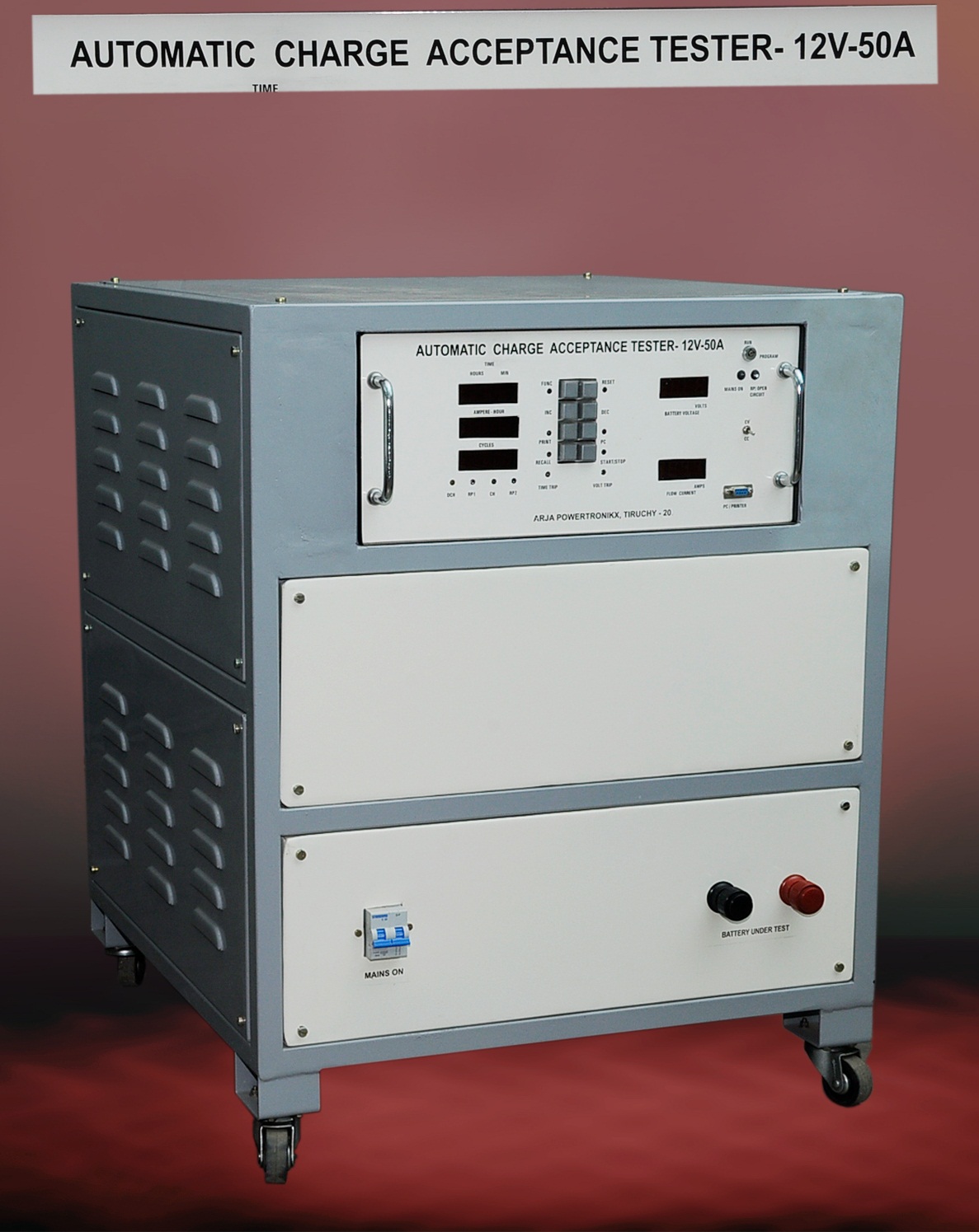 Latest microprocessor based system to do the charge Acceptance tester for lead acid batteries as per Indian standard.It consists of precise timer, constant potential charger, and discharger and cold chamber. It can program, depends upon the battery to be test. It records the tested parameter in memory. After test over data can be transferred to printer or pc through Serial communication.