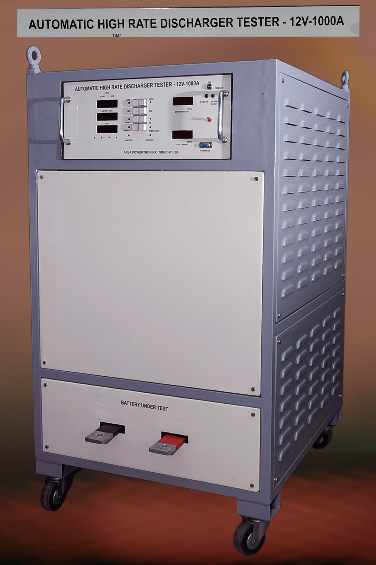 Automatic High Rate Discharge Tester, Powerman’s Mod No.504, is a complete system for performing the High Rate Discharge on Lead Acid Batteries in accordance with various National and International Standards. The equipment designed with Microprocessor, Discharges the battery at a Constant Current to the pre-set voltage level. An elapse time counter records the discharge duration in seconds. Test Termination is automatic.